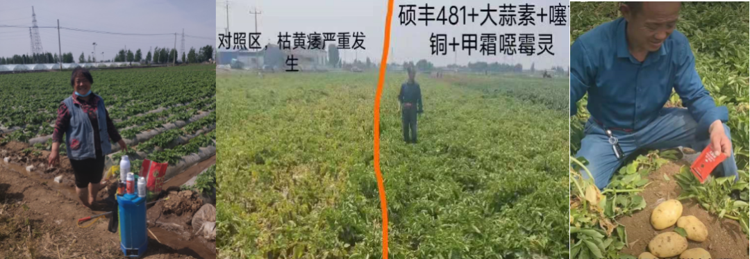 競雙500倍+碩豐481+噻霉酮+甲霜惡霉靈防治土豆枯黃萎病1個(gè)月后,土豆健康生長(cháng),葉片厚綠,死苗少。